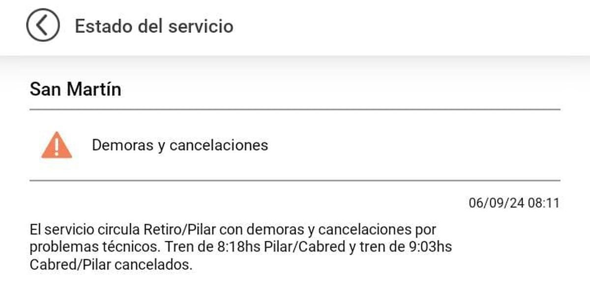 Respecto al Tren San Martín, explicaron que el servicio Retiro/Pilar circula "con demoras y cancelaciones por problemas técnicos". Además, indicaron que el tren de 08:18hs Pilar/Cabred y el tren de 09:03hs Cabred/Pilar fueron cancelados.