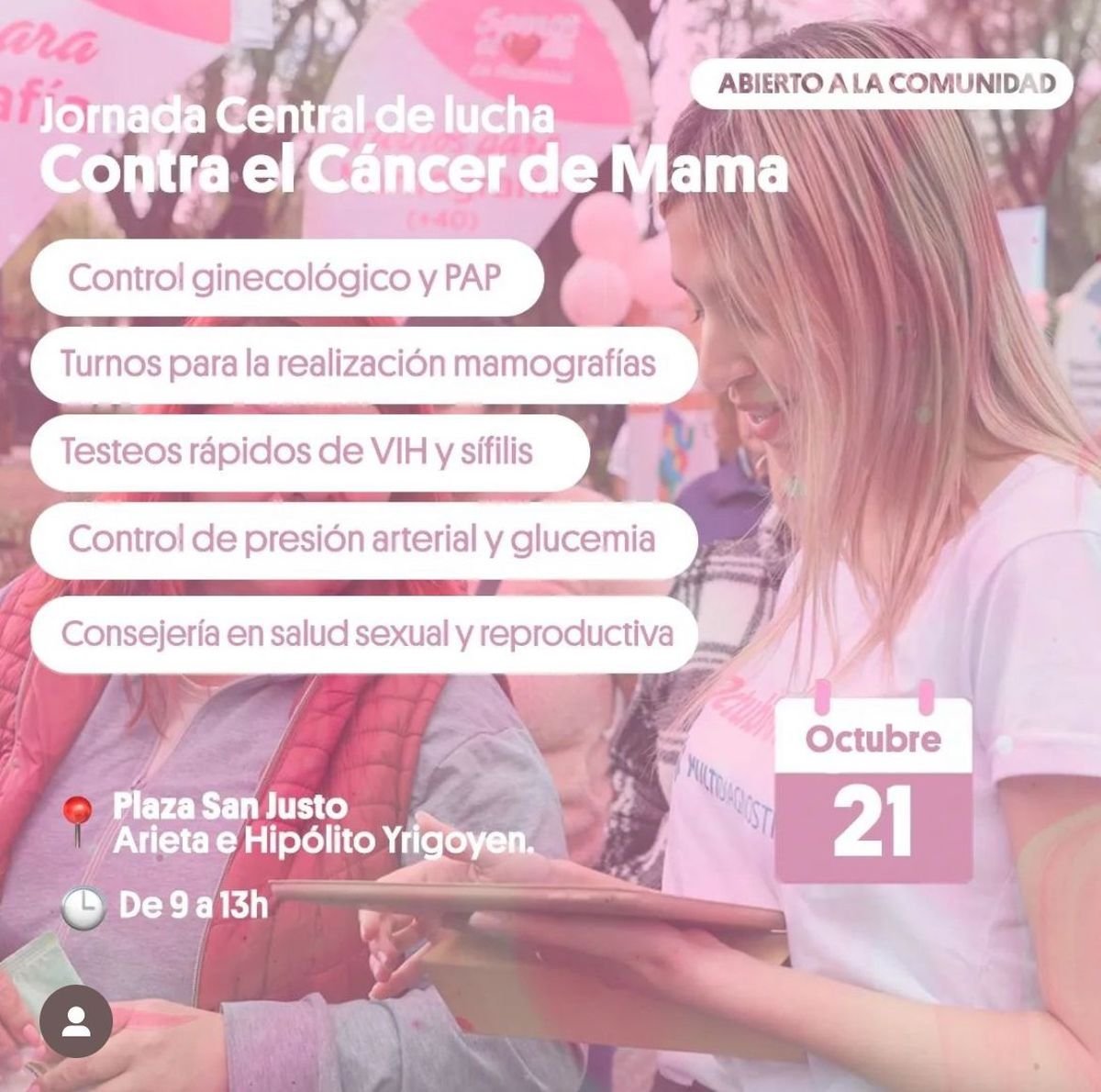 De 09:00 a 13:00 horas, en la plaza principal de San Justo, situada en Arieta e Hipólito Yrigoyen las mujeres mayores de 40 años podrán acceder gratuitamente a controles ginecológicos y Papanicolaou (PAP). Además, se brindarán turnos para la realización de mamografías.