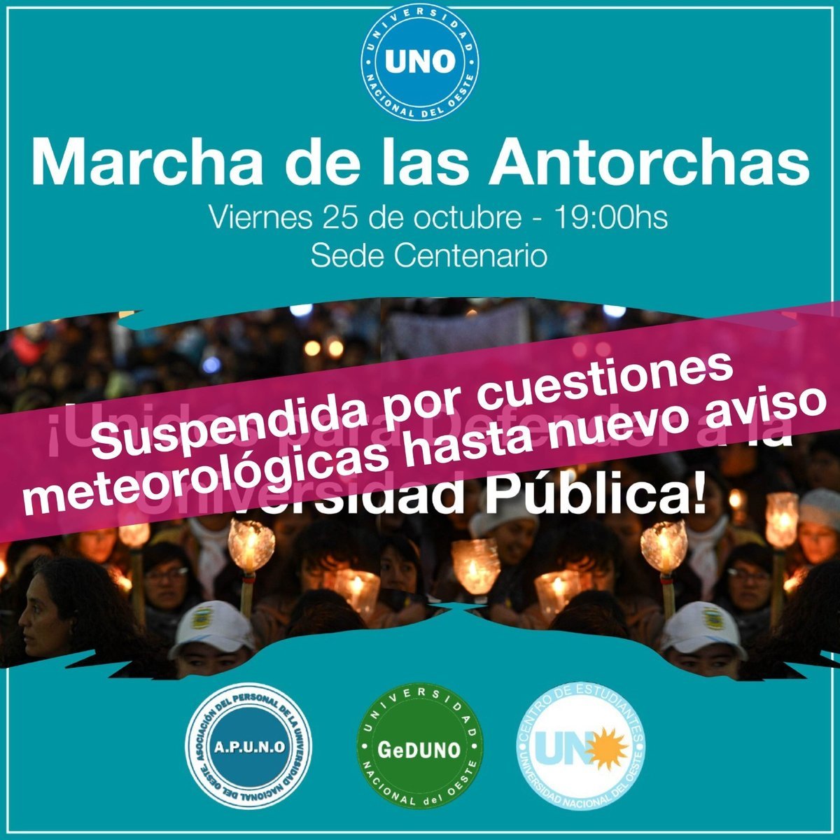En tanto, por estos lados las autoridades de la Universidad Nacional del Oeste (UNO) suspendieron la marcha de antorchas que iban a llevar a cabo a las 19 horas del próximo viernes, 25 de octubre, en la localidad merlense de San Antonio de Padua "por cuestiones meteorológicas hasta nuevo aviso".