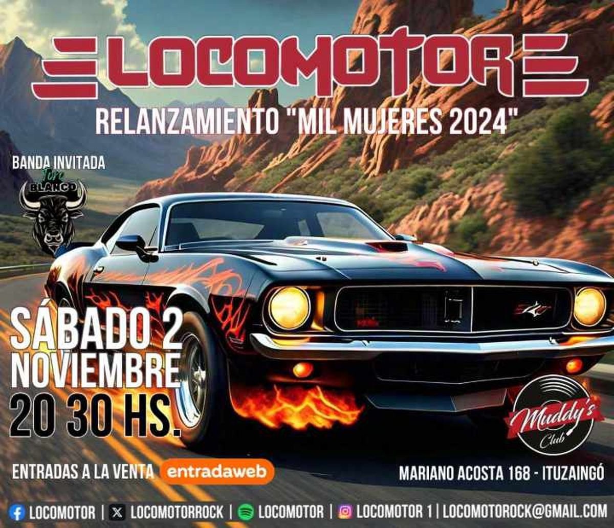 La banda de rock oriunda del partido bonaerense de Ituzaingó, Locomotor, celebrará el relanzamiento digital de su disco "Mil Mujeres" con un prometedor y esperado show local. La cita será este sábado 02 de noviembre, a las 20.30 horas en Muddy´s Club (Mariano Acosta 168, Ituzaingó).