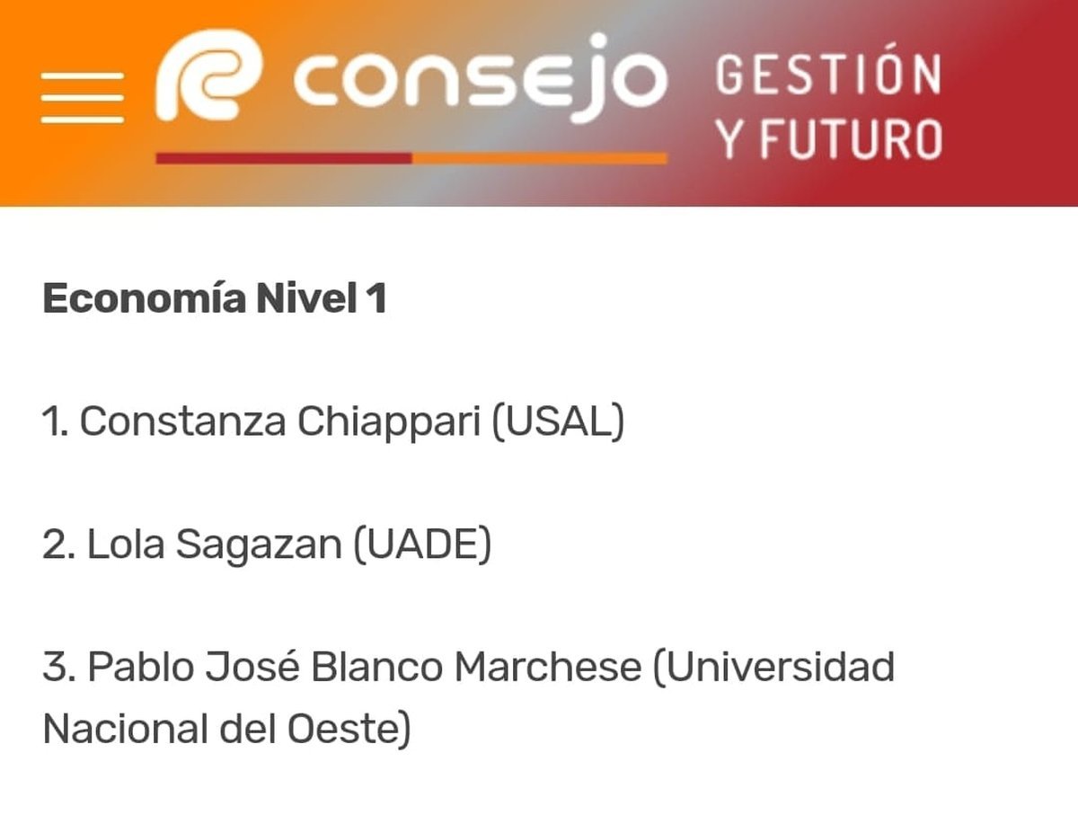En el caso del estudiante local, consiguió el tercer puesto de "Economía Nivel 1" solo por debajo de dos representante de las universidades del Salvador (USAL) y la Argentina de la Empresa (UADE), siendo el único de la región en clasificar al podio de cualquiera de ellas.