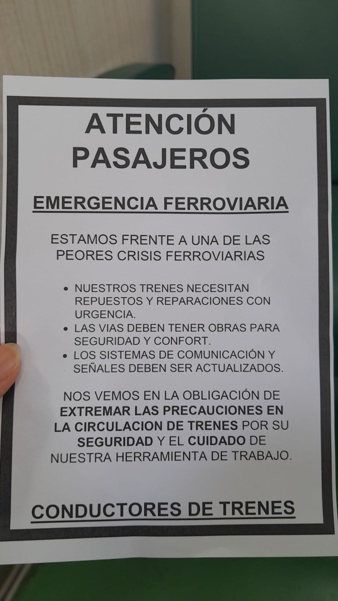 Conjuntamente, varios trabajadores ferroviarios repartieron volantes en varias de las estaciones cabecera que explicaban la decisión en una de las "peores crisis" que el sector atravesó en mucho tiempo: "Nuestras formaciones necesitan repuestos y reparaciones con urgencia. Las vías deben tener obras para seguridad y confort. Los sistemas de comunicación y señales deben ser actualizados".