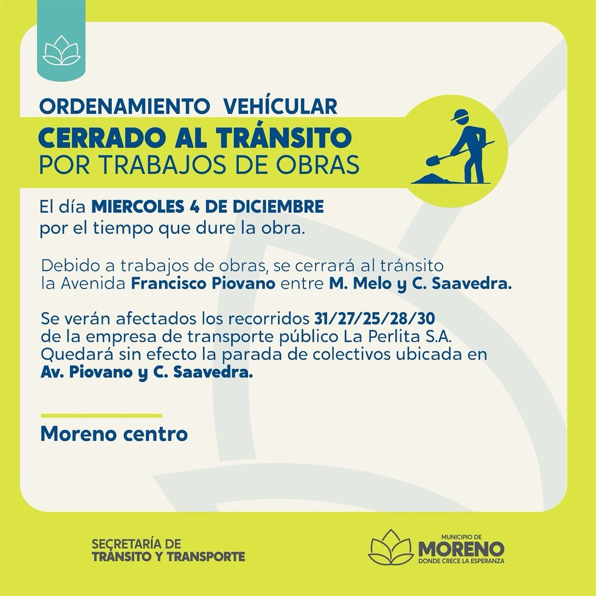 La Secretaría de Tránsito y Transporte del Municipio de Moreno anunció que a partir de hoy miércoles, 4 de diciembre, ya empezó a regir la afectación de cuatro importantes cuadras ubicadas en el lado sur del centro de la localidad cabecera, las cuales deben ser intervenidas para llevar a cabo obras de bacheo y mejoramiento de la calzada.