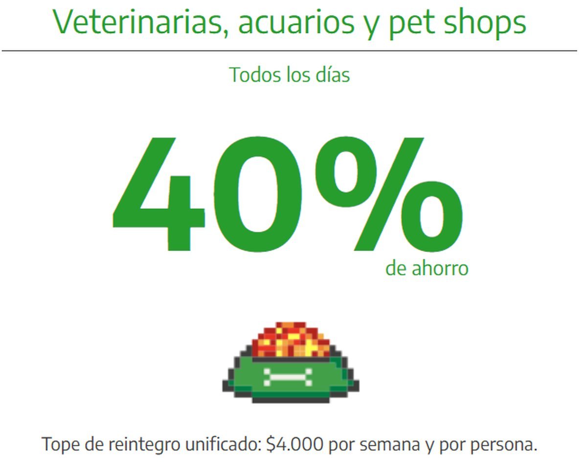 - Pet shops y veterinarias: 40% de descuento todos los días de diciembre, con un tope de $4.000 semanales por persona, que se alcanza con $10.000 en consumos.