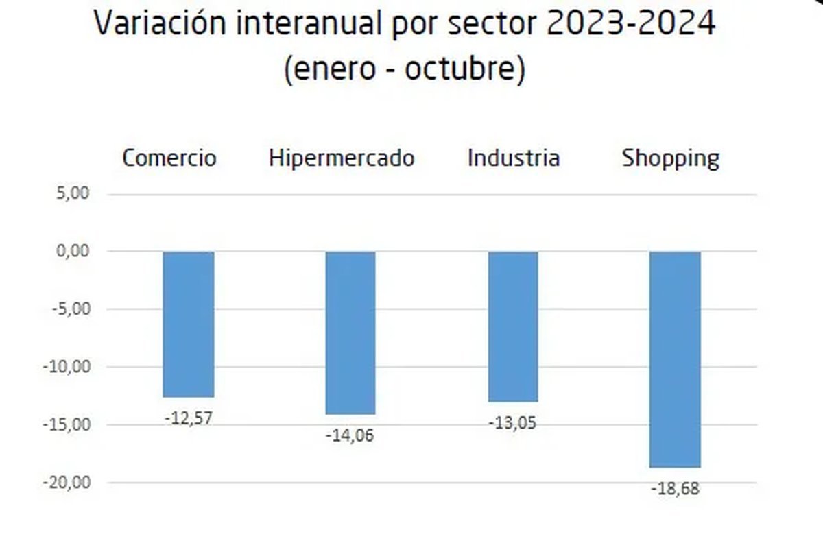Por ejemplo, la caída de ventas en los negocios minoristas fue del 12,6%, estirándose hasta el 14,1% en los hipermercados y al 18,7% en el shopping Plaza Oeste de la localidad de Castelar, y la de la industria del 13,1% si se compara el periodo entre enero y octubre de 2025 con el de 2023.