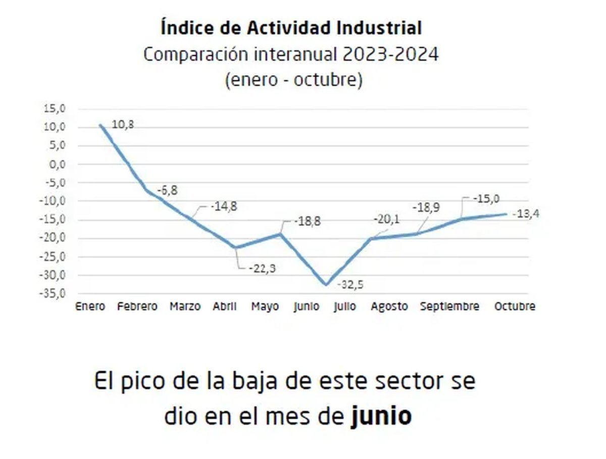 Por su parte, las actividades industriales que mayor baja padecieron en ese mismo mes respecto al del año pasado corresponden a las de química y petroquímica (-15,5%), gráfica (-15,2%), maderas (15%) y metalmecánica (-9,1%).