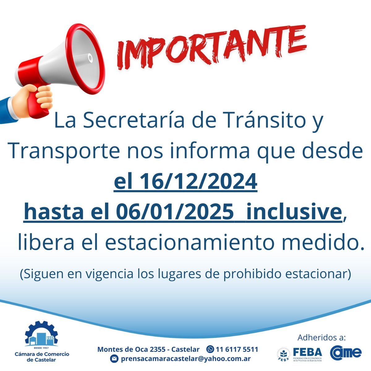 La Secretaría de Tránsito y Transporte del Municipio de Morón y la Cámara Comercial e Industrial de la ciudad de Castelar anunciaron que el sistema de estacionamiento medido (SEM) del Distrito, el cual había generado "malestar" en varios vecinos, va a dejar de implementarse a partir de la semana que viene.