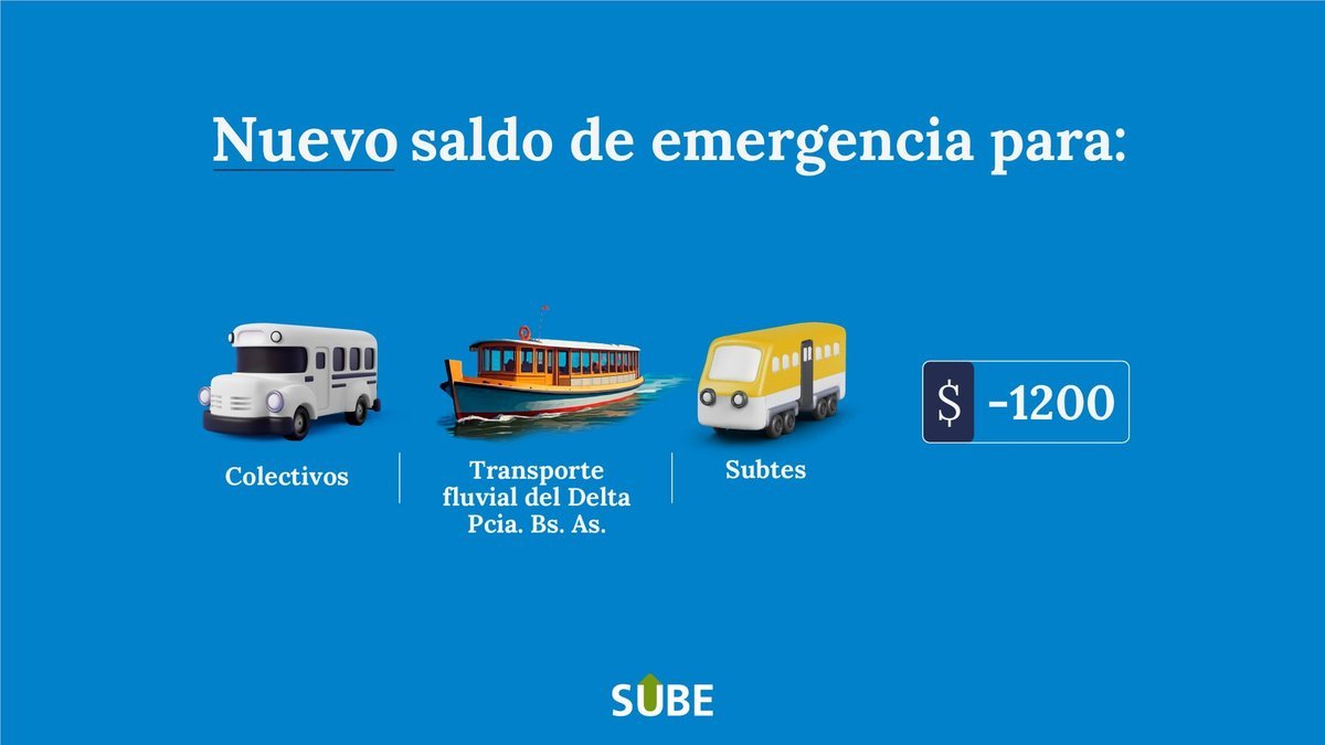 El nuevo saldo de emergencia de la tarjeta SUBE será de $ 1.200 para colectivos de todas las localidades que viajan con SUBE, subtes de la ciudad de Buenos Aires y transporte público fluvial en el Delta de la provincia de Buenos Aires (en boleterías).