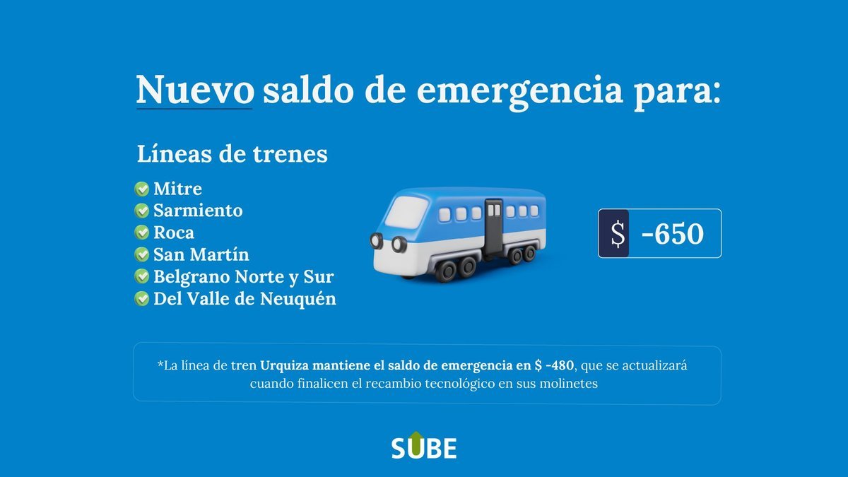 Mientras que el nuevo saldo para las líneas de trenes del AMBA (Mitre, Sarmiento, Roca, San Martín, Belgrano Norte y Sur, y el Tren del Valle de Neuquén) pasará a $ 650. Por su parte, la línea de tren Urquiza mantendrá el saldo de emergencia en - 480 pesos hasta que finalicen los trabajos de recambio tecnológico necesarios en sus molinetes.