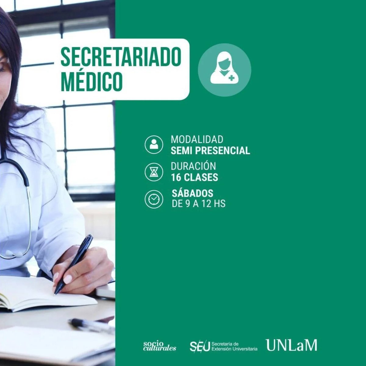 - Secretario médico: modalidad semi presencial, duración 16 clases, se dicta los sábados de 09:00 a 12:00hs.