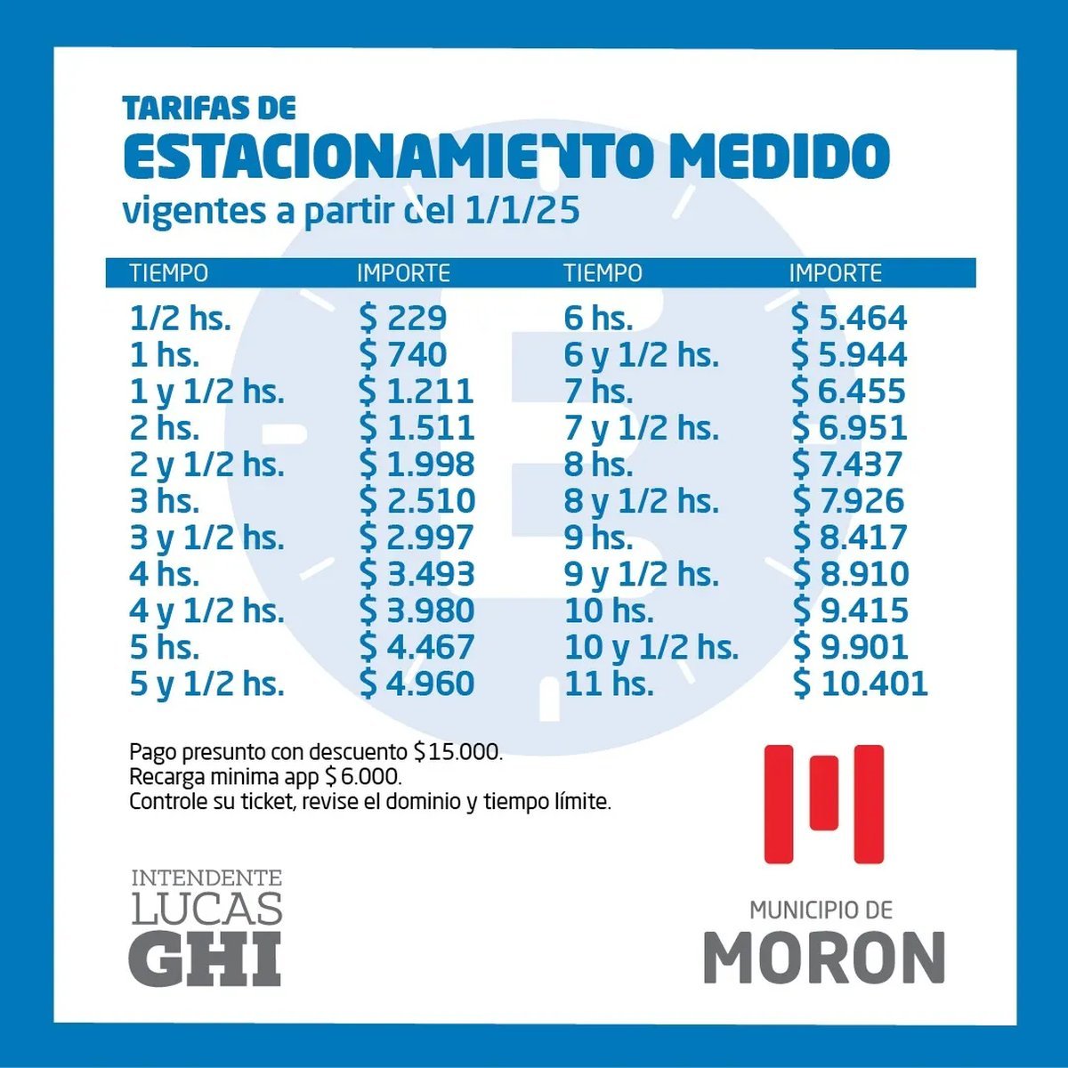 Tras varias semanas sin funcionar en por de incentivar las compras locales, el estacionamiento medido en Morón vuelve a operar y con un aumento en los valores que se cobra en las áreas centrales de Morón y Castelar. Con el nuevo cuadro tarifario el valor de la hora pasó a $740.