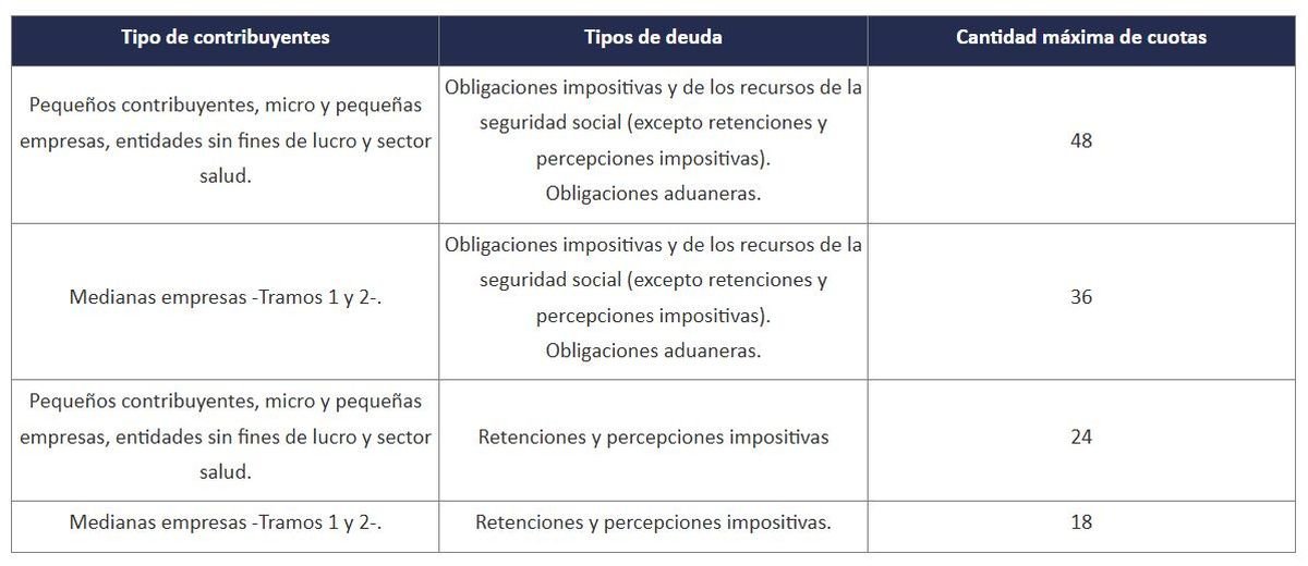 La Agencia de Recaudación y Control Aduanero (ARCA), ex AFIP, pondrá a disposición planes de facilidades de pago de hasta 4 años para las micro, pequeñas o medianas empresas, entidades sin fines de lucro, contribuyentes del sector de salud y pequeños contribuyentes, para regularizar sus deudas tributarias.