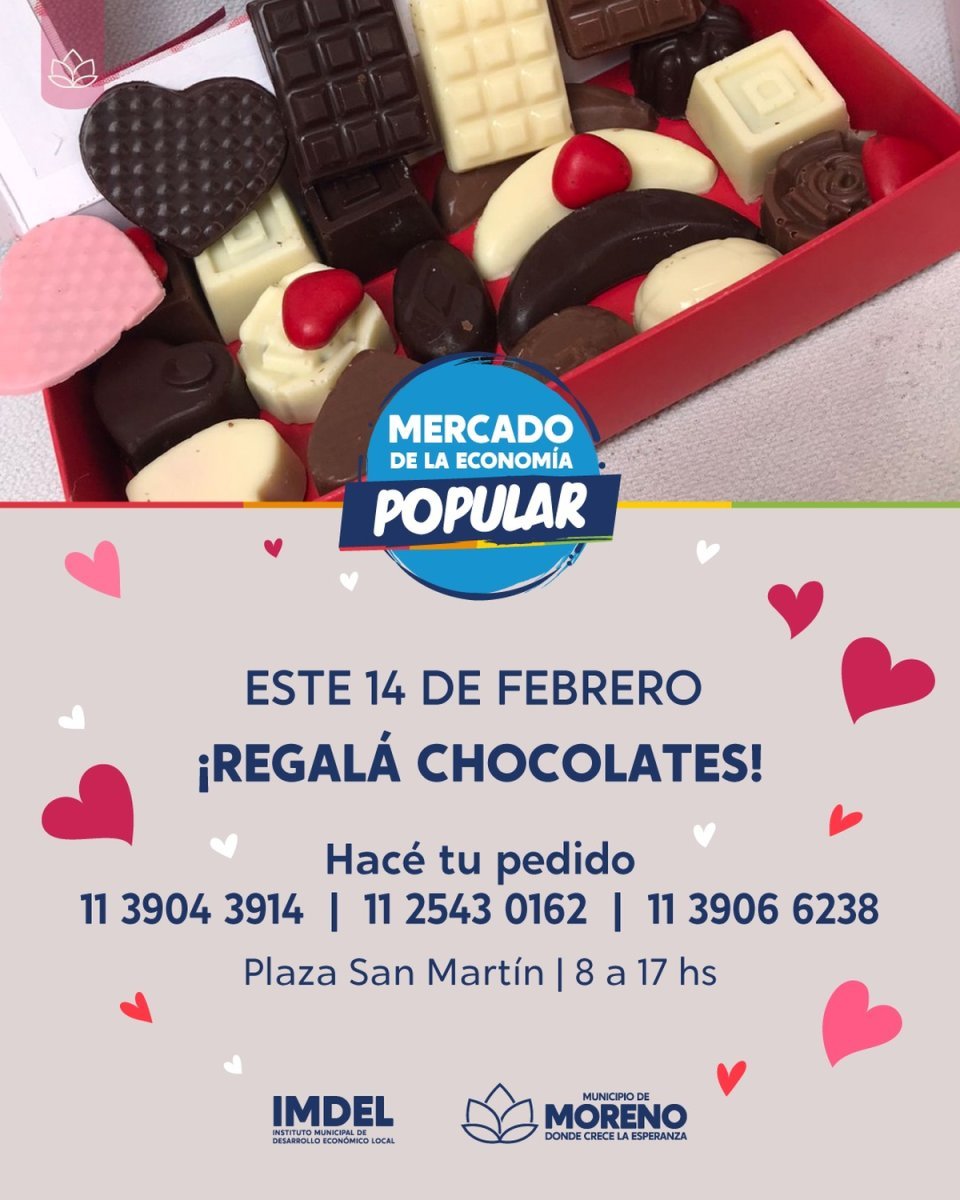 Por otra parte, en Moreno, este viernes 14 de febrero, habrá feria local por el Día de los Enamorados, para que encuentran productos para realizar un regalo a la persona especial en su día. La misma se ubicará en Plaza San Martín (Av. Bartolomé Mitre 2898), de 8 a 17 horas. "Tenemos el regalo perfecto para esa persona especial: desde deliciosos chocolates artesanales, hasta joyería hecha a mano. Apoyá el trabajo local y celebrá con productos elaborados con amor y dedicación", señaló el Municipio local.