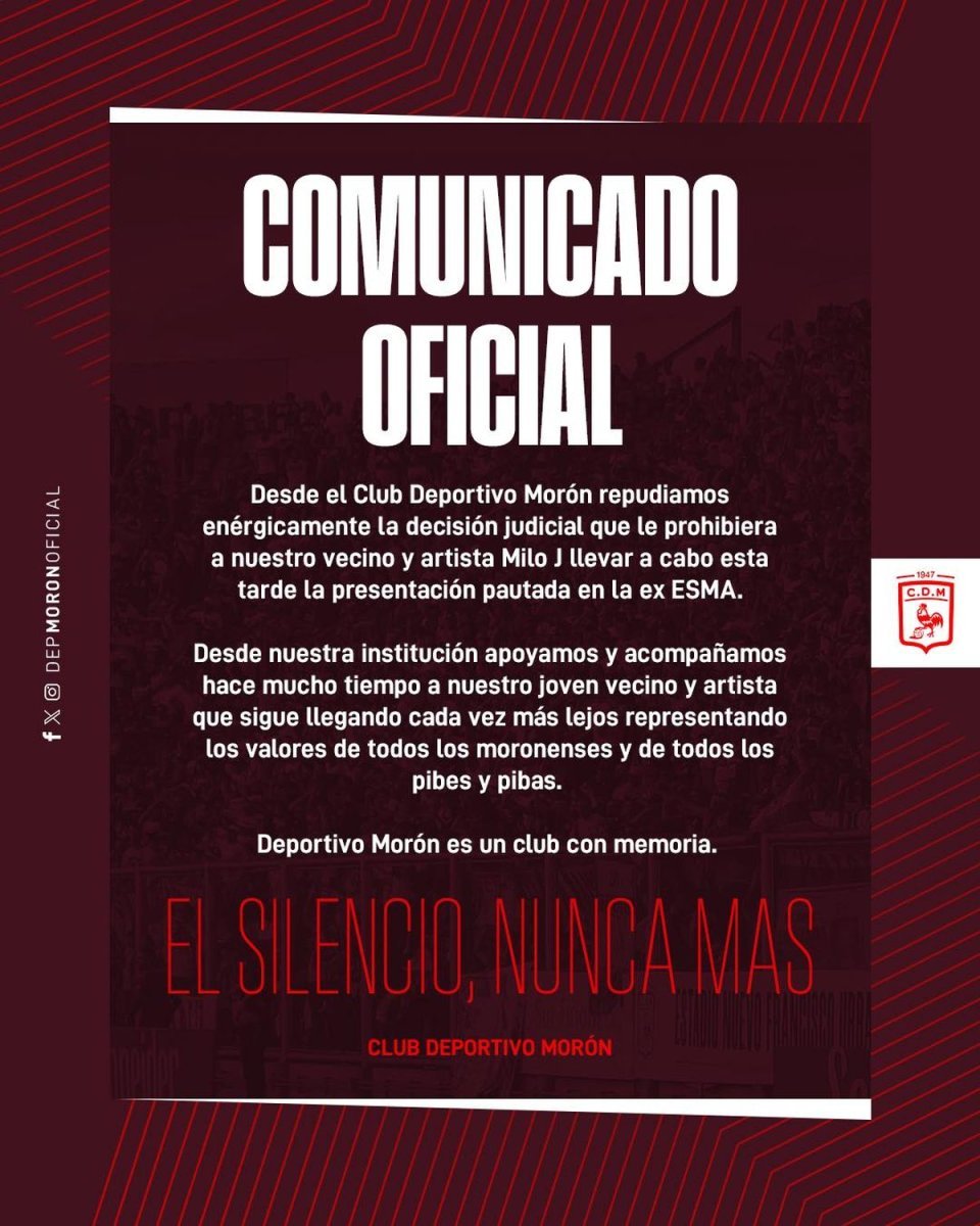 A través de sus redes sociales oficiales, desde la institución deportiva expresaron: "Repudiamos enérgicamente la decisión judicial que le prohibiera a nuestro vecino y artista Milo J llevar a cabo la presentación pautada en la ex ESMA", y agregaron que desde el club apoyan y acompañan "hace mucho tiempo a nuestro joven vecino y artista que sigue llegando cada vez más lejos representando los valores de todos los moronenses y de todos los pibes y pibas".