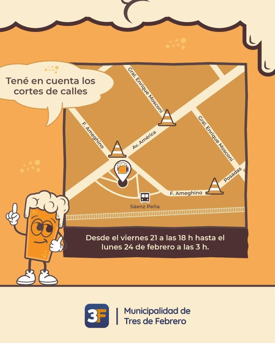 Por otro lado, desde la organización indicaron que para "una mejor organización" habrá circulación reducida en las calles aledañas a la Plaza M. Moreno, en este sentido se verán afectadas al tránsito F. Ameghino, Gral. Enrique Mosconi, Av. América y Posadas desde el viernes 21 de febrero a las 18:00hs, hasta el lunes 24 de febrero a las 03:00 horas.