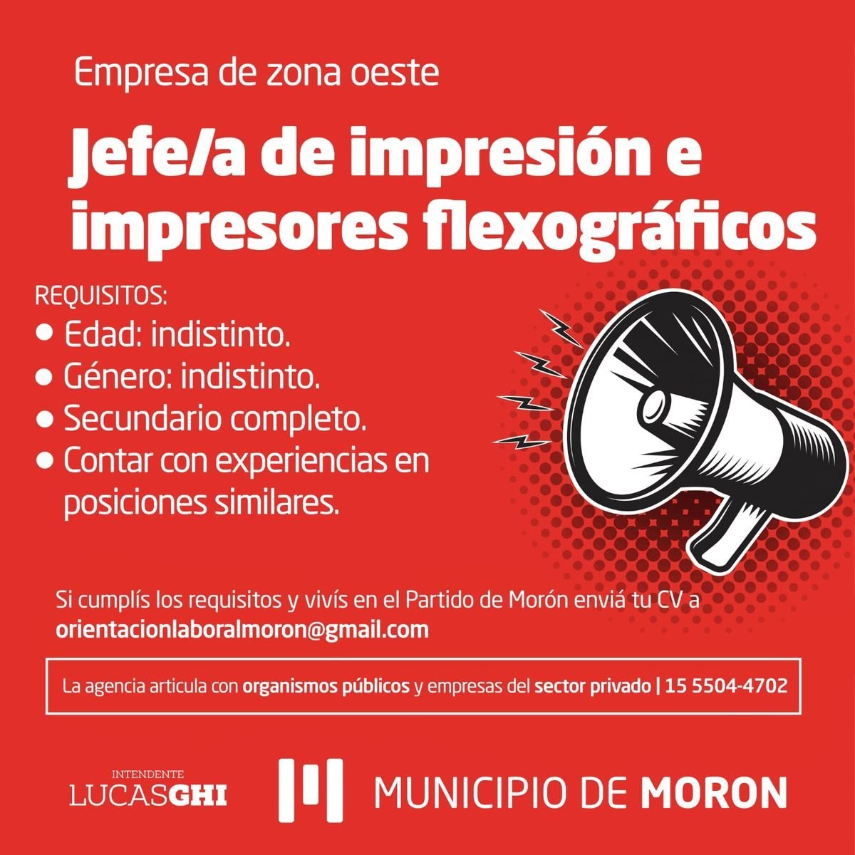 - Requisitos: edad y género indistinto, secundario completo, contar con experiencia en posiciones similares y residir en el distrito.