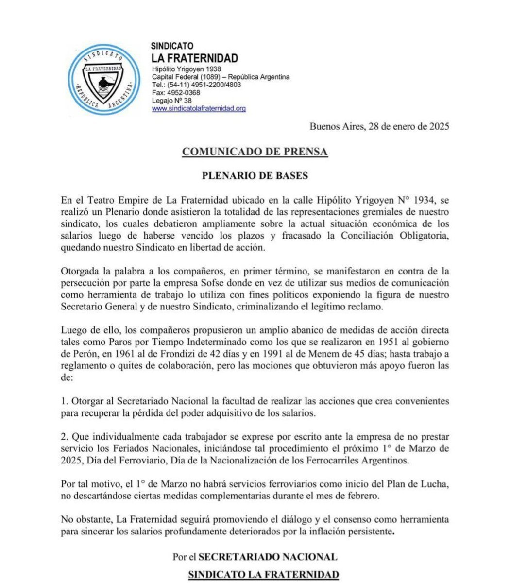 "Que individualmente cada trabajador se exprese por escrito ante la empresa de no prestar servicio los Feriados Nacional, iniciándose tal procedimiento el próximo 1° de marzo de 2025, Día del Ferroviario, Día de la Nacionalización de los Ferrocarriles Argentinos", explicaron y remarcaron que frente a esto "el 1° de marzo no habrá servicios ferroviarios como inicio del Plan de Lucha, no descartándose ciertas medidas complementarias".