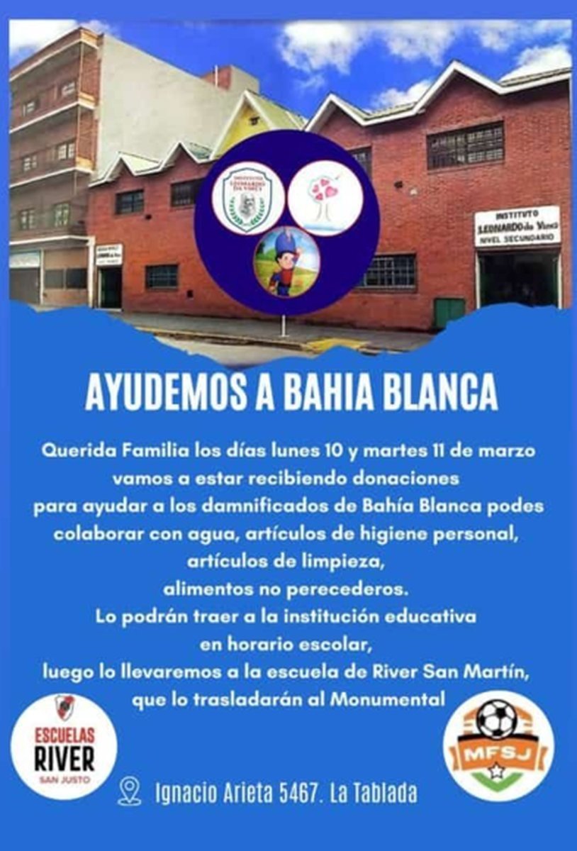 Este lunes 10 y martes 11 de marzo, la escuela ubicada en Ignacio Arieta 5467, La Tablada estará recibiendo agua, artículos de higiene personal, artículos de limpieza y alimentos no perecederos en el horario escolar. Luego se encargarán de llevarlo a la escuela de River San Martín para que lo trasladen al estadio Monumental.