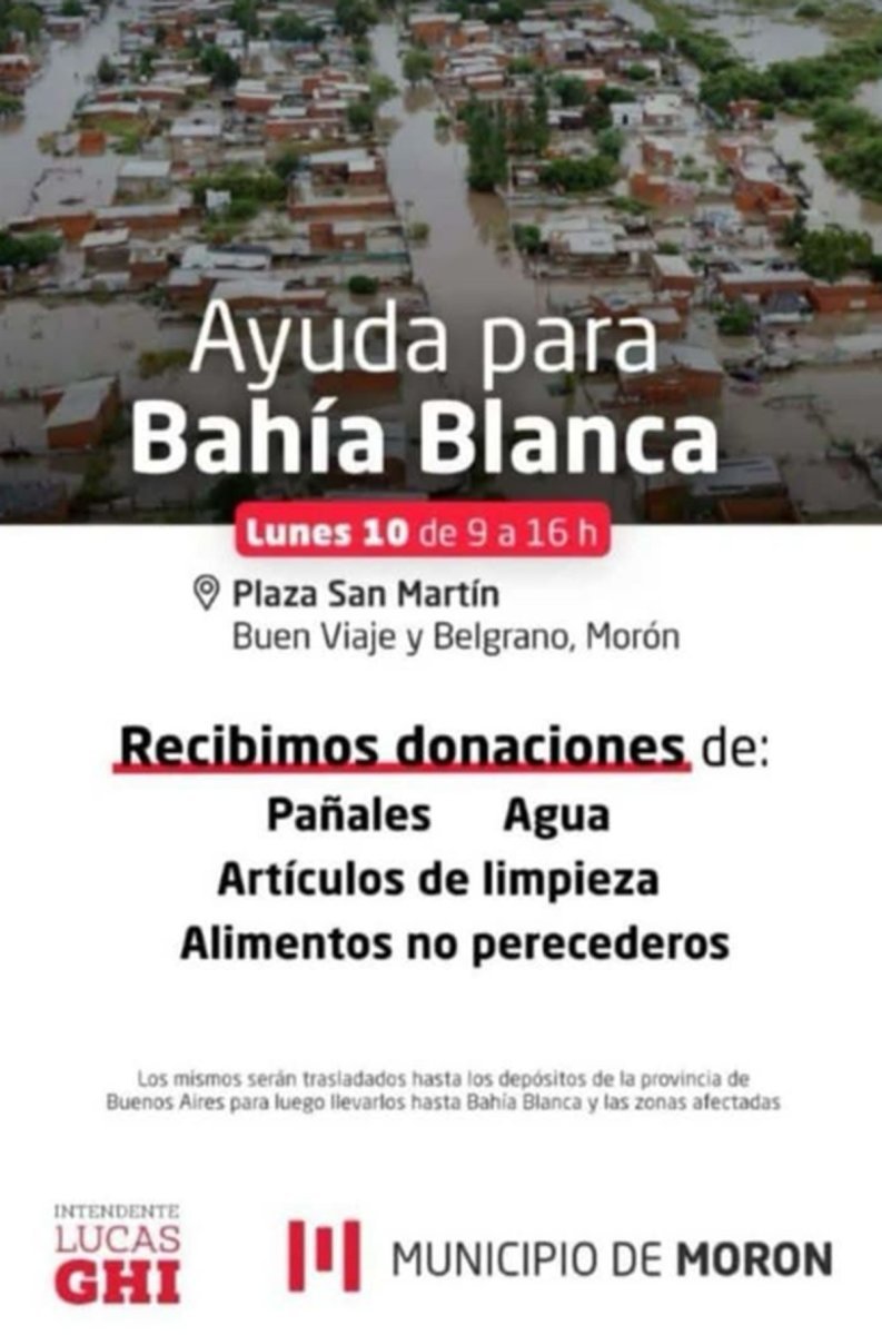 Este lunes, 10 de marzo, de 09:00 a 16:00 horas el Municipio de Morón recibirá donaciones en la Plaza San Martín, Buen Viaje y Belgrano, Morón centro para las familias afectadas por el temporal. Allí, recolectarán pañales, agua, artículos de limpieza y alimentos no perecederos que después serán trasladados a los depósitos de la Provincia de Buenos Aires para luego llevarlos hasta Bahía Blanca y las zonas afectadas.