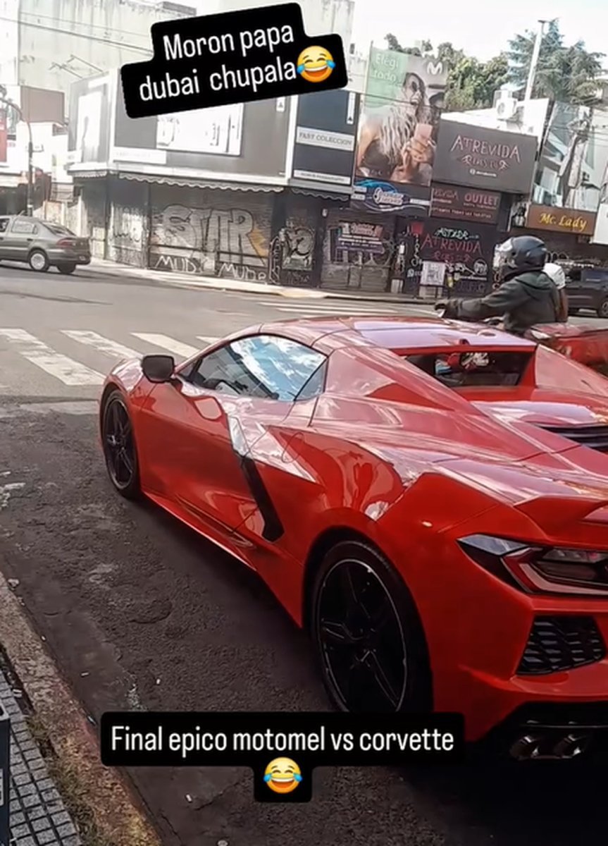 El video, compartido por el usuario @eldidiboy, muestra una divertida secuencia entre las personas que se encuentran alrededor del Corvette. Allí, el conductor de la moto arengado por sus amigos acelera el vehículo pero el Corvette no acepta la invitación. En paralelo, transeúntes le pedían al conductor del auto de alta gama "acelera eso".