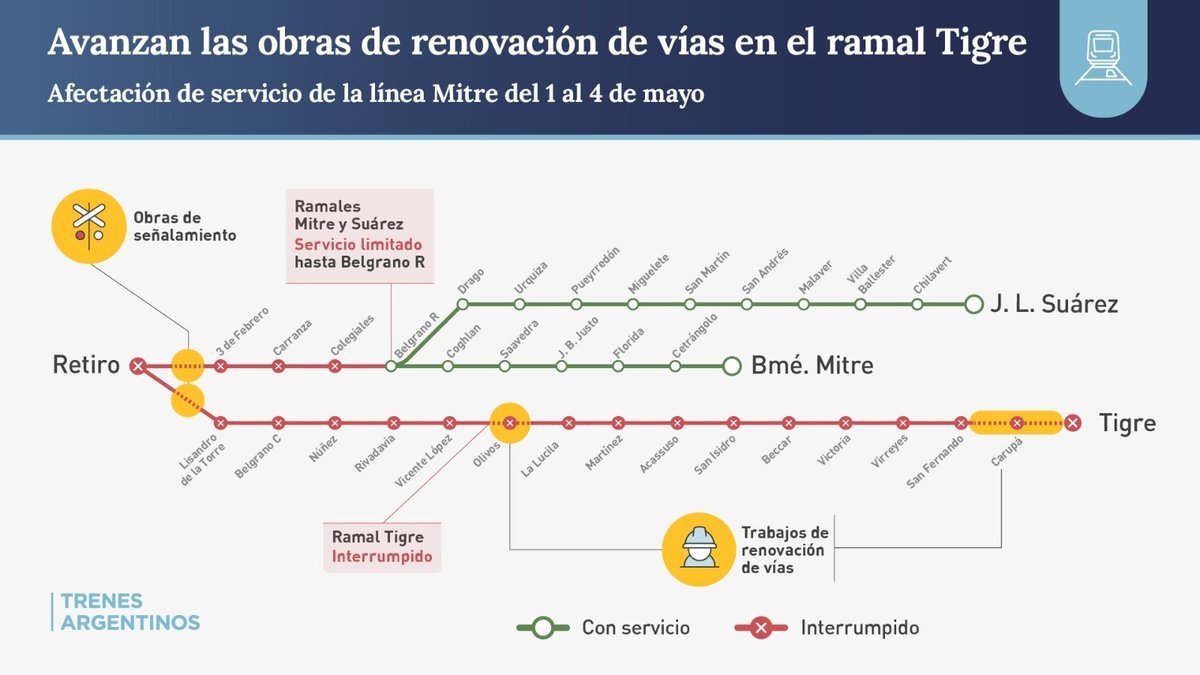 En ese sentido, durante el fin de semana largo, entre el 1° y 4 de mayo, el ramal Tigre estará interrumpido; mientras que los ramales Bme. Mitre y José L. Suárez funcionarán limitados hasta Belgrano R. A su vez, desde el lunes 5 de mayo y hasta el 1° de junio, el ramal Tigre funcionará limitado entre Retiro y Victoria sin llegar a la estación cabecera Tigre.