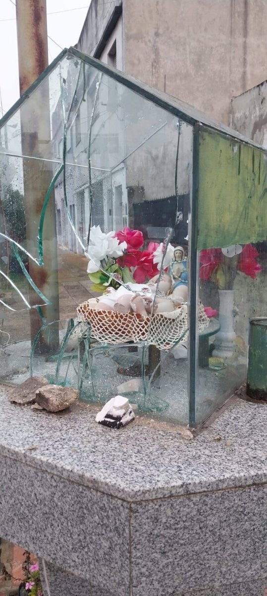 La imagen dañada corresponde al niño Jesús y a la Virgen María, que están rodeados por unas ofrendas florales y piedras dentro de un compartimento vidriado que resultó abierto a la fuerza presuntamente con un objeto contundente, por lo que ahora deberá ser repuesto para evitar que las figuras que guardaba se deterioren.