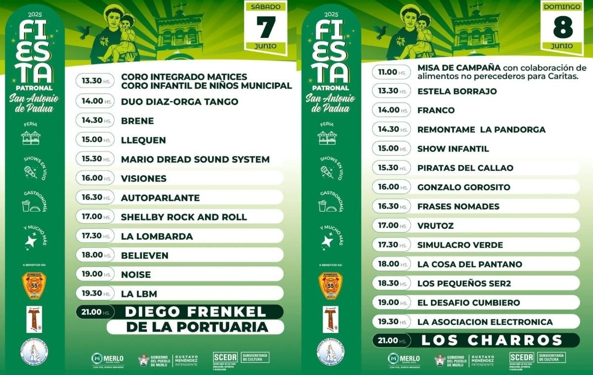 La Subsecretaría de Cultura del Municipio de Merlo confirmó todos los detalles de las futuras fiestas patronales de la localidad de San Antonio de Padua, las cuales tendrán lugar como todos los años en la Plaza San Héctor Valdivielso Sáez y realizadas en honor al sacerdote de origen portugués Antonio de Padua.