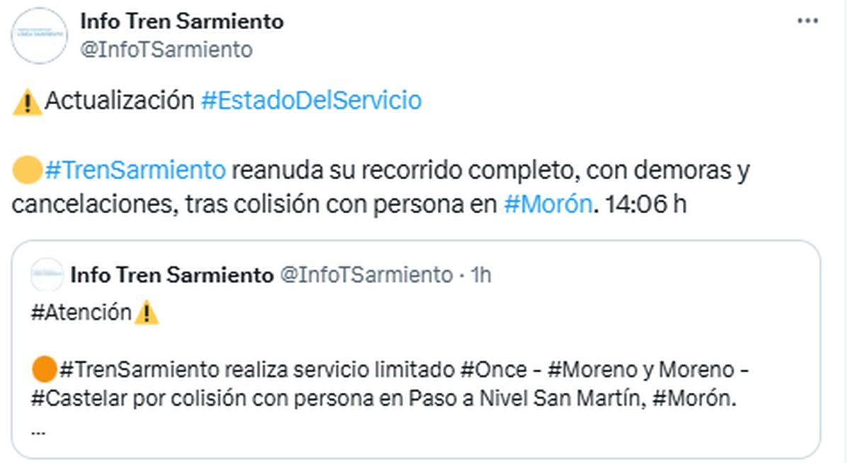 Frente a esto, desde Trenes Argentinos explicaron que el Tren Sarmiento reanudó su recorrido completo, pero con demoras y cancelaciones tras colisión con persona en Morón.