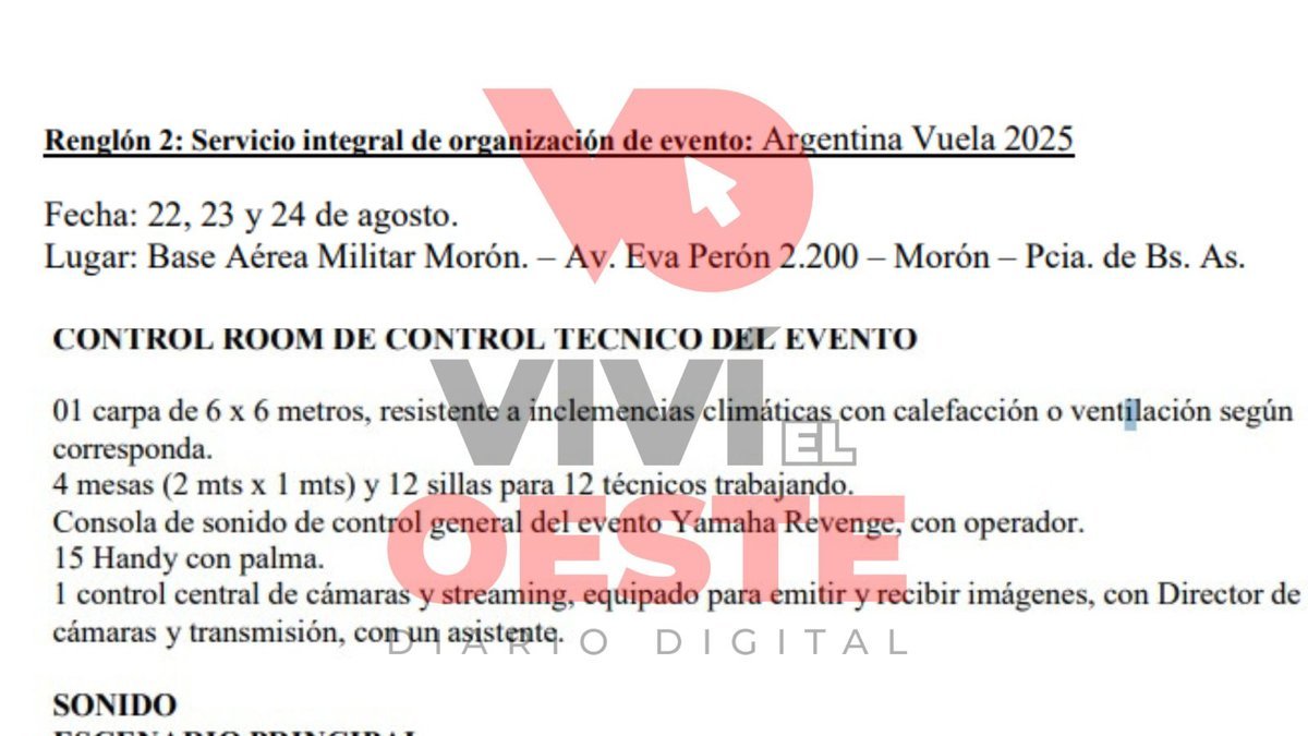 En los pliegos, a los cuales Viví el Oeste pudo acceder en exclusiva, se detalla la búsqueda de una carpa para oficiar de sala de control técnico, un escenario principal, varios proyectores del tipo LED destinados al patio de comidas, el salón histórico y sectores y múltiples gabinetes de sonido, por ejemplo.
