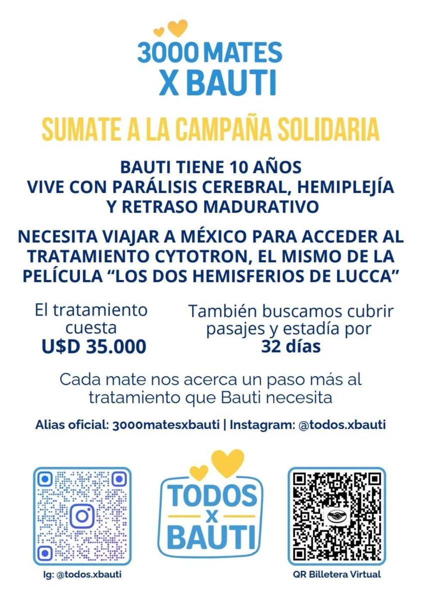 En sintonía Victoria agrega: "Al ser un tratamiento muy costoso, por estadía y acompañamiento ya que consta de 32 días de procesos médicos y no contar con los recursos correspondientes nos vimos obligados a hacer una campaña para alcanzar los 35.000 dólares que se requieren". Para eso creamos la Campaña "3000 mates X Bauti" ya que eso sería el equivalente al costo del tratamiento pero también hay que pensar en la estadía y pasajes.