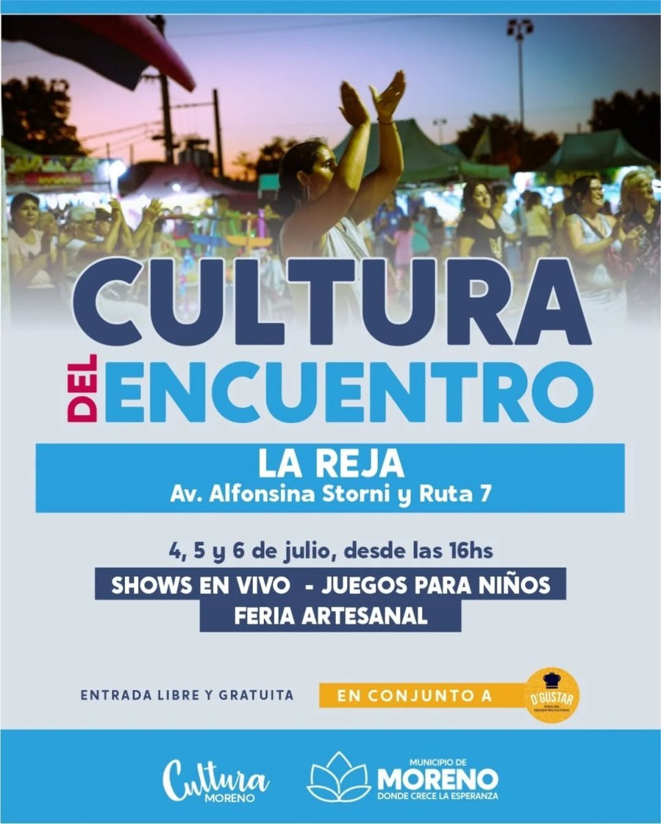 - Además, del viernes 4 al domingo 6 desde las 16:00 horas, se podrá disfrutar del "Parador Cultural del Encuentro", en Av. Alfonsina Storni y Ruta 7, La Reja. Habrá shows en vivo con grandes cierres, patio gastronómico, juegos para niñas, niños y feria artesanal.