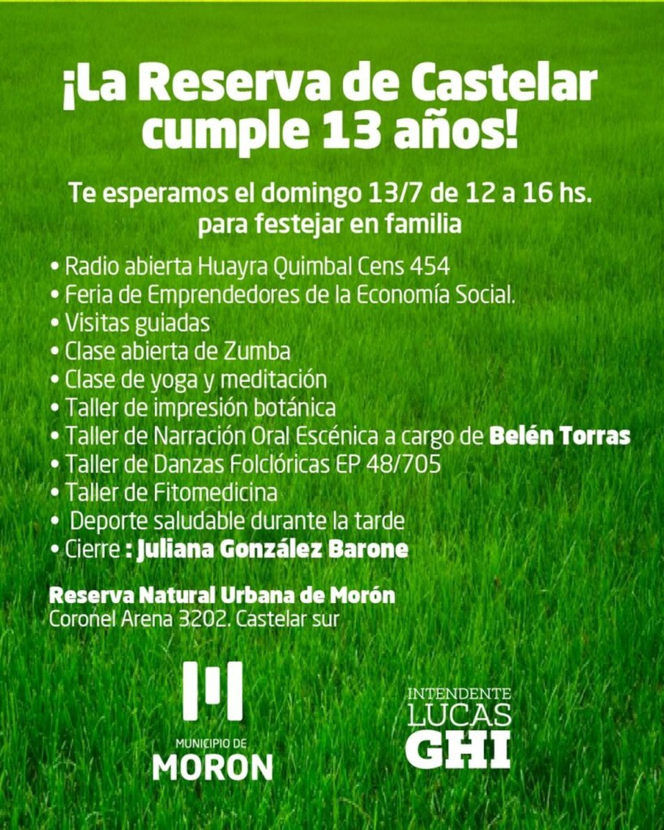 La Subsecretaría de Políticas Culturales del Municipio de Morón anunció que este fin de semana se va a llevar a cabo la celebración por el aniversario número 13 de la Reserva Natural Urbana de la localidad de Castelar, la cual tuvo su inauguración el 30 de junio de 2012.