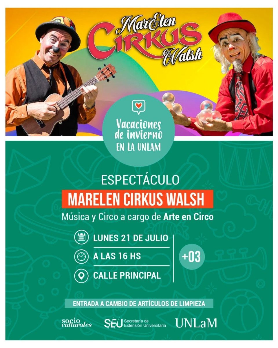 De cara al receso escolar, las autoridades de la UNLaM diagramaron diferentes actividades para los más chicos. La entrada al espectáculo es una donación. Vacaciones de invierno en San Justo Shopping: juegos, shows, sorpresas y mucho más Vacaciones de Invierno en Hurlingham: vuelve el Parque de Invierno, gratuito y para toda la familia Vacaciones de invierno en Tecnópolis: cómo reservar tu entrada sin cargo y visitarlo