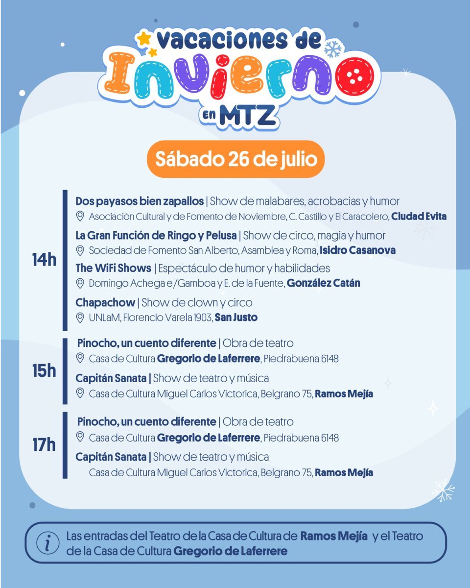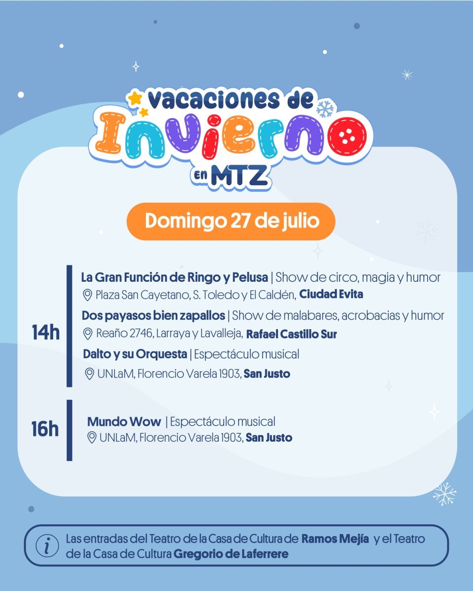 Morón, Ituzaingó, Moreno, La Matanza, Merlo, Hurlingham y más partidos de Zona Oeste se preparan para el primer fin se semana de vacaciones de invierno de los más chicos y organizaron diferentes propuestas con entrada libre y gratuita para disfrutar en familia.