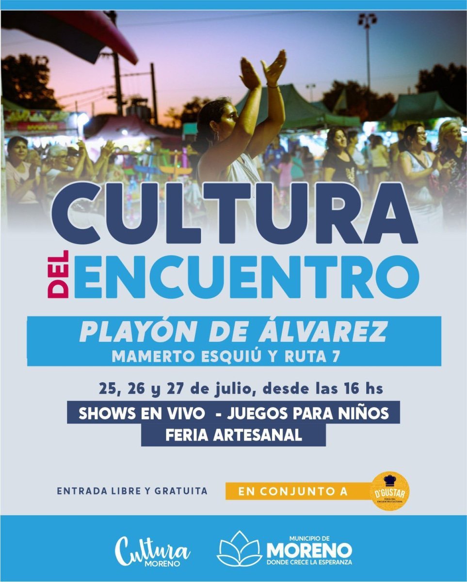 En el Playón de Álvarez, se ubicará el Parador Cultura del Encuentro con patio gastronómico, juegos para niños y feria artesanal, shows en vivo y con entrada libre y gratuita. La cita será desde este viernes 25 y hasta el domingo 27 desde las 16:00 horas en el espacio ubicado en Mamerto Esquiú y Ruta 7.