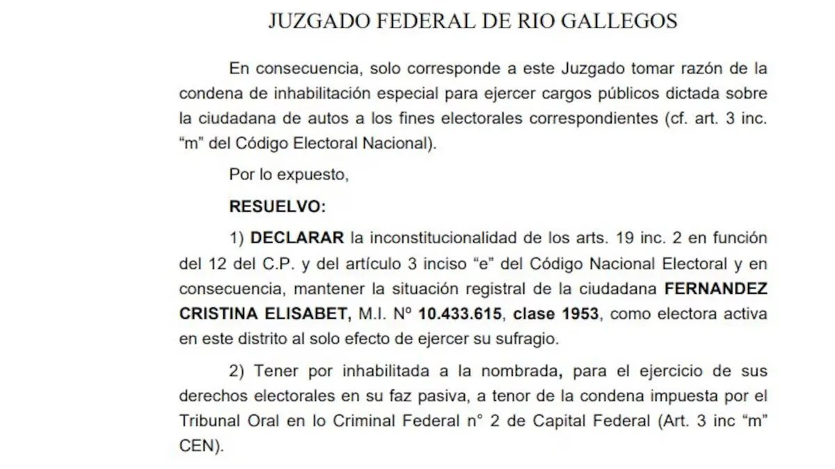 Desde el TOF N°2, en el marco de la Causa Vialidad, le impidió ejercer el voto hasta que culmine su condena el 16 de junio de 2031, argumentando que "solo corresponde a este Juzgado tomar razón de la condena de inhabilitación especial".