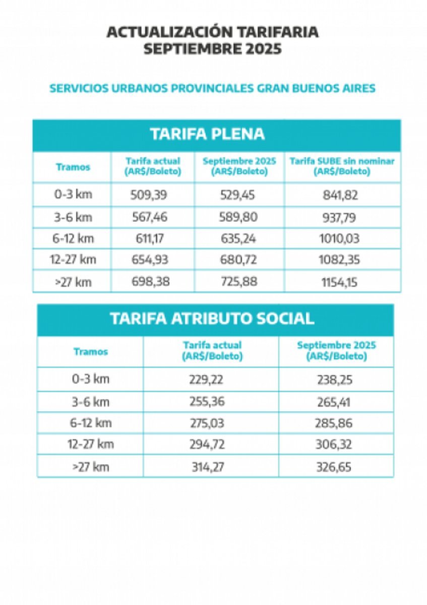 En lo que va del año, los cuadros tarifarios del transporte automotor acumulan un alza de 42,27% en PBA y 41,43% en CABA. En agosto, los boletos subieron 3,8%. Desde abril, las tarifas del transporte público en ambas jurisdicciones se actualizan todos los meses, de acuerdo con la inflación más 2% adicional sobre la tarifa previa.