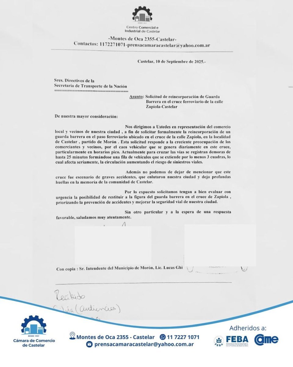 Frente al malestar de los vecinos y comerciantes de la zona por la quita de la figura del guardabarrera de la calle Zapiola de Castelar, uno de los paso a nivel más usados por la comunidad, la Cámara de Comercio de dicha localidad de Morón, envío una carta a la Secretaría de Transporte de la Nación.