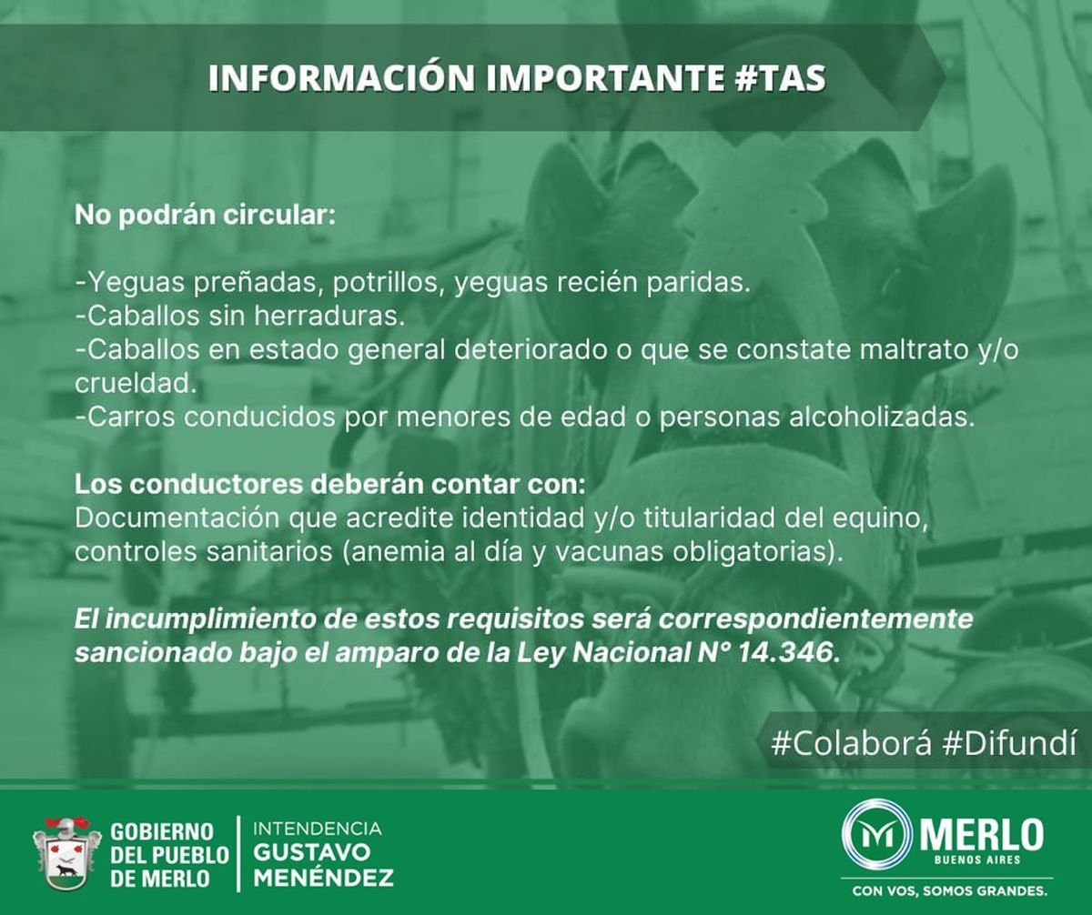 Además, los conductores deberán contar con documentación que acredite identidad y/o titularidad del equino, controles sanitarias (anemia al día y vacunas obligatorias).