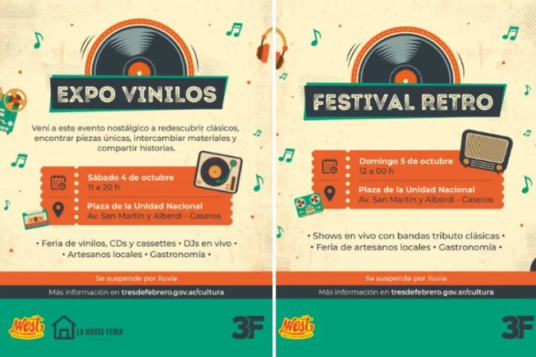 Desde el Municipio de Tres de Febrero, invitaron a la Expo Vinilos y el gran Festival Retro, dos eventos que recorrerán la historia de la música mediante objetos vintage y canciones interpretadas por bandas tributo. La cita será en la Plaza de la Unidad Nacional (Av. San Martín y Alberdi – Caseros), el sábado 4 de 11:00 a 20:00 hs, y el domingo 5 de 12:00 a 00:00 hs.