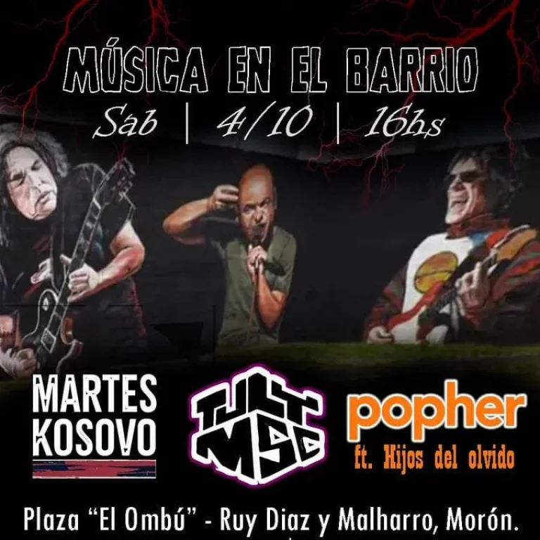 En Morón, en la Plaza "El Ombú", ubicada en Ruy Diaz y Malharro se realizará el evento Música en mi barrio desde las 16:00 horas. Allí tocarán Martes Kosovo, Tuly Msc y Popher ft. Hjos del olvido, una propuesta con entrada libre y gratuita para que los vecinos disfruten al ritmo de estas bandas de rock conformadas por amigos del barrio. El evento tendrá un fin solidario, quienes se acerquen pueden llevar un alimento no perecedero para colaborar con personas en situación de calle, por cada alimento se llevarán un número para participar de un sorteo de una chomba del Club Morón.
