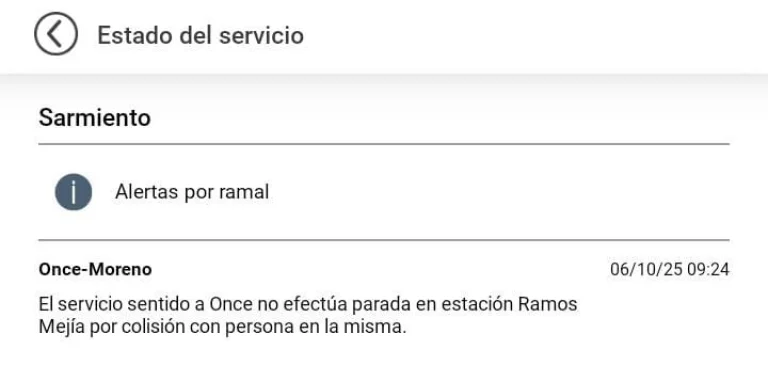 En concreto, desde la empresa estatal explicaron que para el ramal Once - Moreno "el servicio sentido a Once no efectúa parada en estación Ramos Mejía por colisión con persona en la misma".