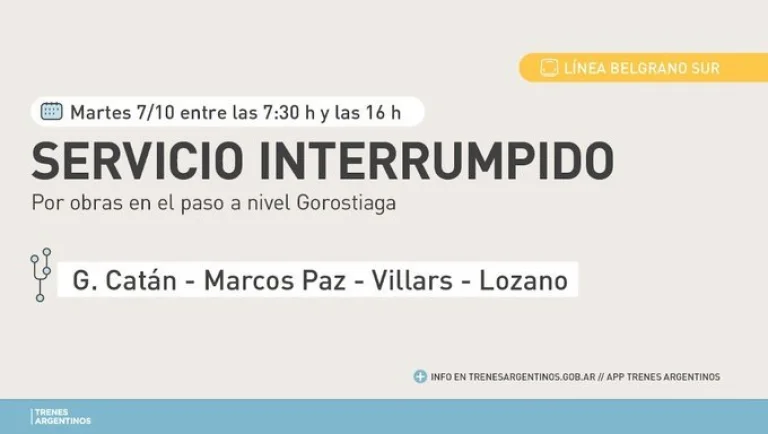 Desde la empresa estatal, explicaron que "el martes 7/10 entre las 07:30 h y las 16:00 h estará interrumpido el servicio G. Catán - Lozano por obras en el paso a nivel Gorostiaga entre 20 de junio y Marcos Paz", e indicaron los horarios de los primeros y últimos trenes.