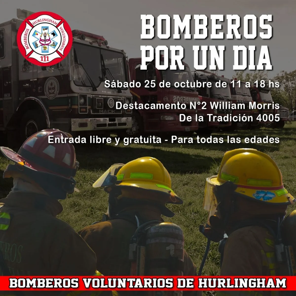 El próximo sábado 25 de octubre, de 11:00 a 18:00 horas, los Bomberos Voluntarios de Hurlingham realizarán una nueva edición de "Bombero por un día", para que la comunidad puede experimentar la labor de ser bomberos a través de diferentes actividades en el Destacamento N.º 2 de Williams Morris, ubicado en De la Tradición 4005.