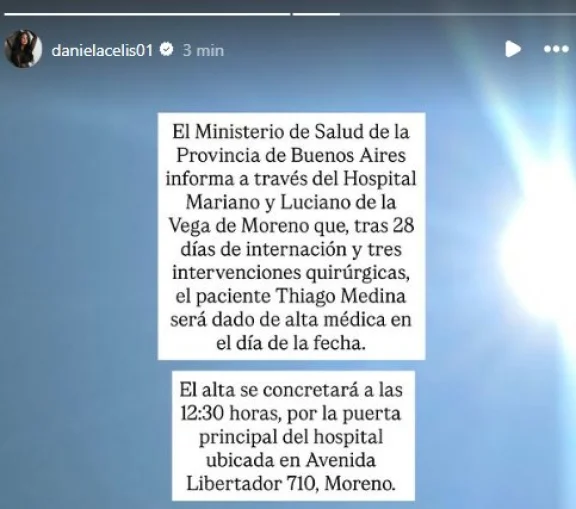 A través de sus redes sociales, Daniela Celis comunicó la noticia con alegría: "Llegó el día tan esperado, con mucha emoción, lágrimas en los ojos, piel de pollo, les queremos contar que el Ministerio de Salud de la Provincia de Buenos Aires informa que a través del Hospital Mariano y Luciano de la Vega de Moreno que, tras 28 días de internación y tres intervenciones quirúrgicas, el paciente Thiago Medina será dado de alta médica".