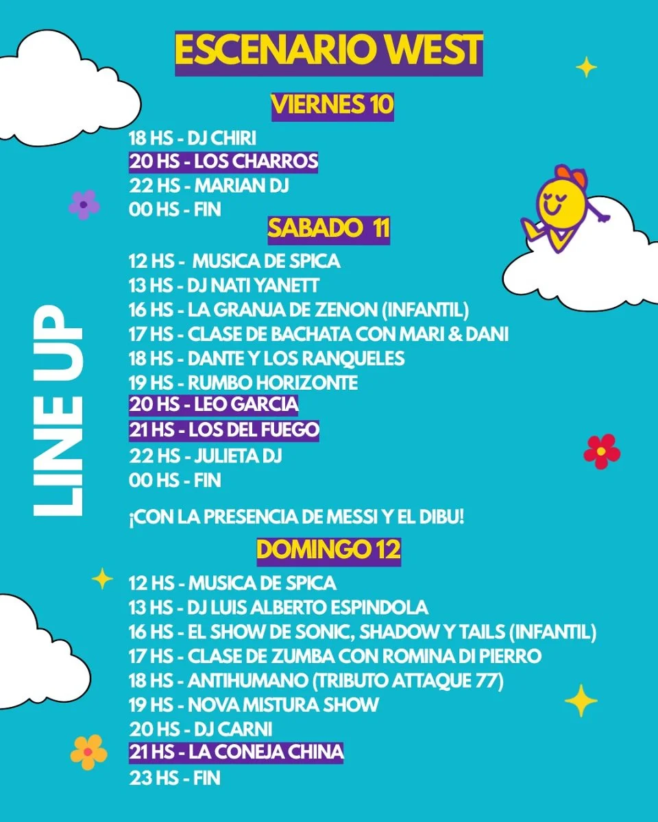 Desde la organización anunciaron que habrá más de 15 artistas, shows y Dj's en vivo confirmados "que van a hacer vibrar la plaza", además propuestas para toda la familia y diferentes propuestas gastronómicas. El viernes a las 20:00 hs se presentarán Los Charros, el sábado a las 20:00 hs Leo García y a las 21:00 hs Los del Fuego.