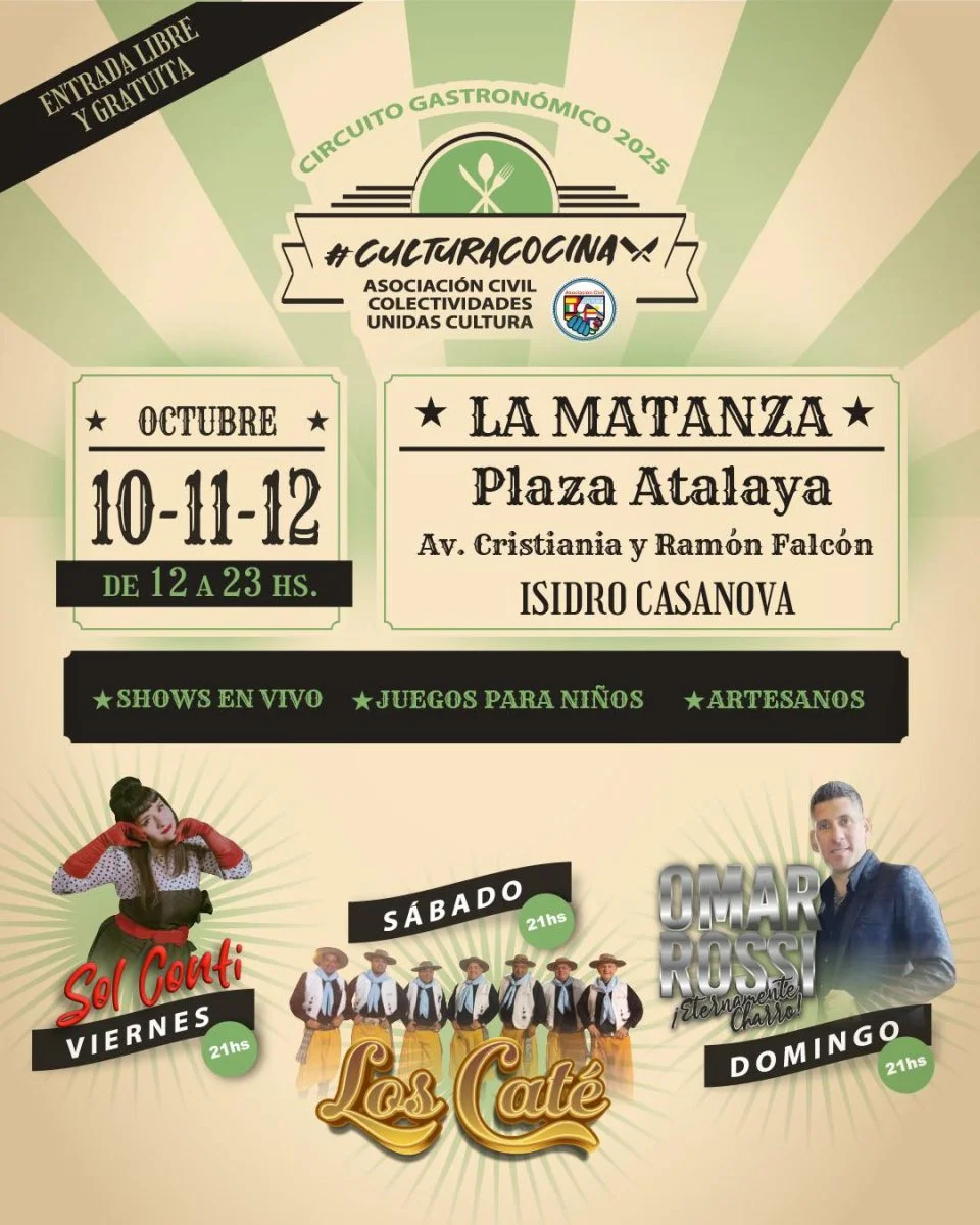 Por otro lado, en la Plaza Atalaya (Av. Cristiania y Ramón Falcón) de Isidro Casanova de La Matanza, se desarrollará la feria Cultura Cocina desde este viernes 10 al domingo 12 de 12:00 a 23:00 horas, son shows en vivo, juegos para niños y artesanos.