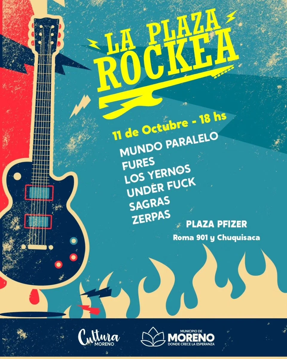 El sábado 11 de octubre, a partir de las 18:00 horas, se llevará a cabo el festival "La Plaza Rockea" con la presentación en vivo de Mundo Paralelo, Fures, Los Yernos, Under Fuck, Sagras y Zerpas, en Plaza Pfizer ubicada en Roma 901 y Chuquisaca con entrada libre y gratuita.