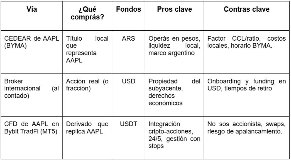 Importante: CFD ≠ acción al contado. Si querés custodiar fracciones reales de AAPL o cobrar dividendos, te conviene un broker internacional con cuenta de valores o el CEDEAR local de Apple que cotiza en BYMA. Esa alternativa también la repasamos al final para que elijas con información completa.