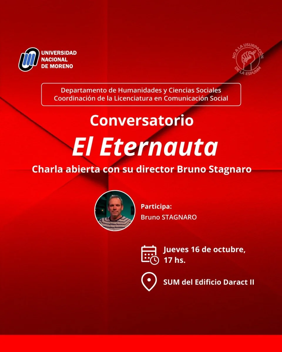 A través de un comunicado oficial, las autoridades de la Universidad Nacional de Moreno, invitaron a la comunidad a participar del Conversatorio "El Eternauta", una charla abierta a la comunidad con su director, Bruno Stagnaro con entrada libre y gratuita.